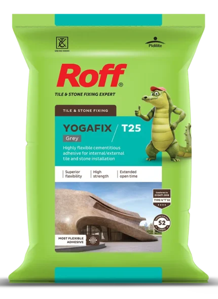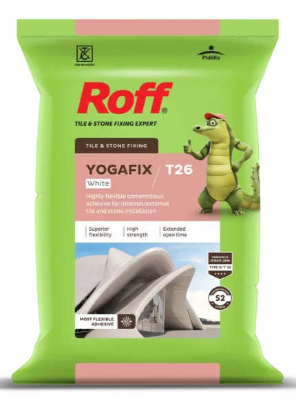 Roff Yogafix Grey & White is a high polymer modified & highly flexible adhesive with enhanced properties of slip resistant, extended open time & excellent bond strength which is necessary for fixing large format tiles/ natural stones & slim tiles on vertical & horizontal surface for indoor as well as outdoor application especially in external conditions, high footfall areas & on substrates subject to high deformations/ vibrations.