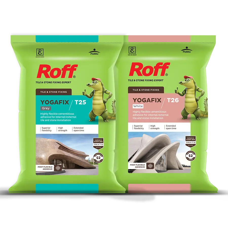 Roff Yogafix Grey & White is a high polymer modified & highly flexible adhesive with enhanced properties of slip resistant, extended open time & excellent bond strength which is necessary for fixing large format tiles/ natural stones & slim tiles on vertical & horizontal surface for indoor as well as outdoor application especially in external conditions, high footfall areas & on substrates subject to high deformations/ vibrations.